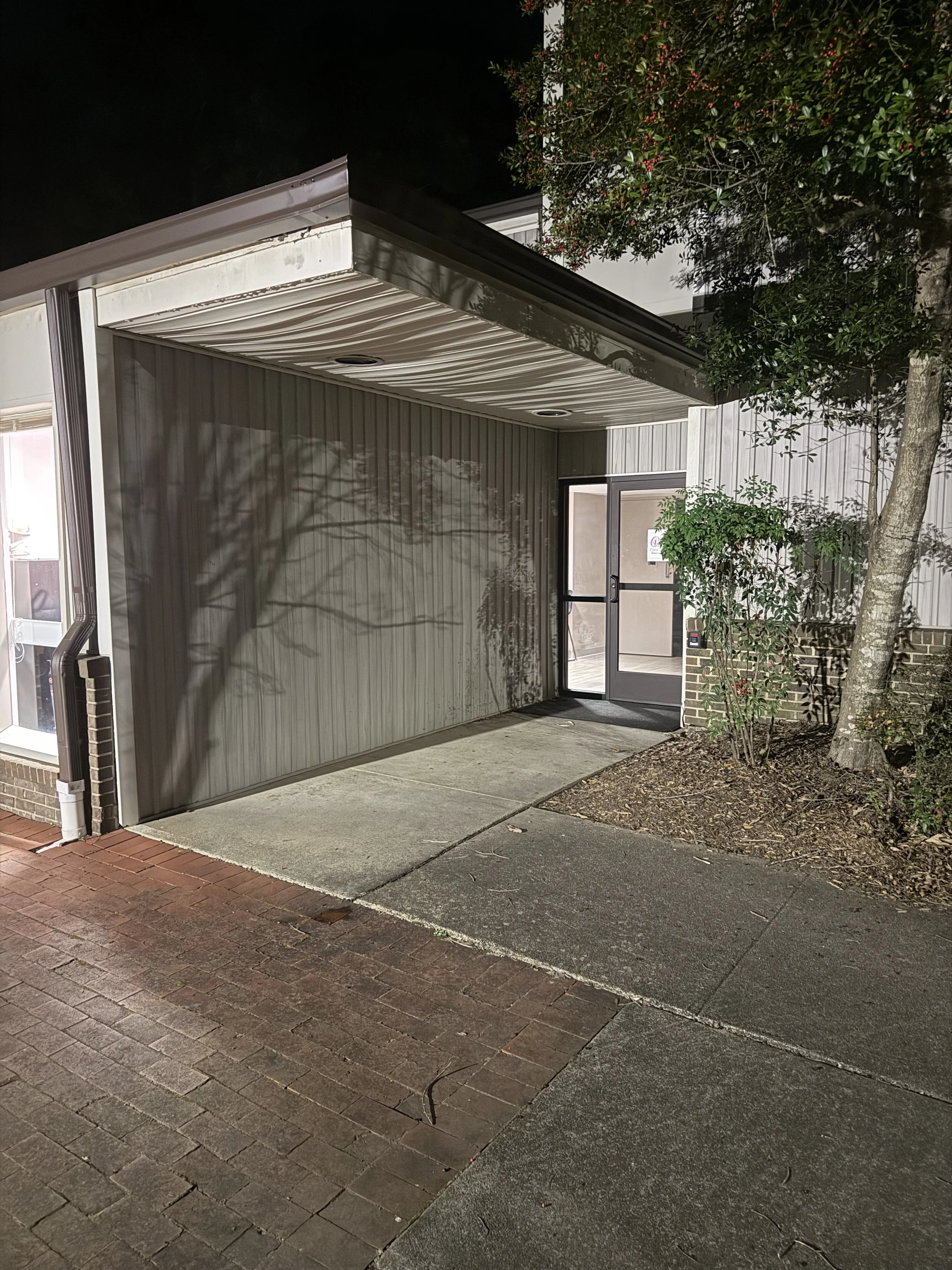 Park near the handicap spots in front of the brick courtyard